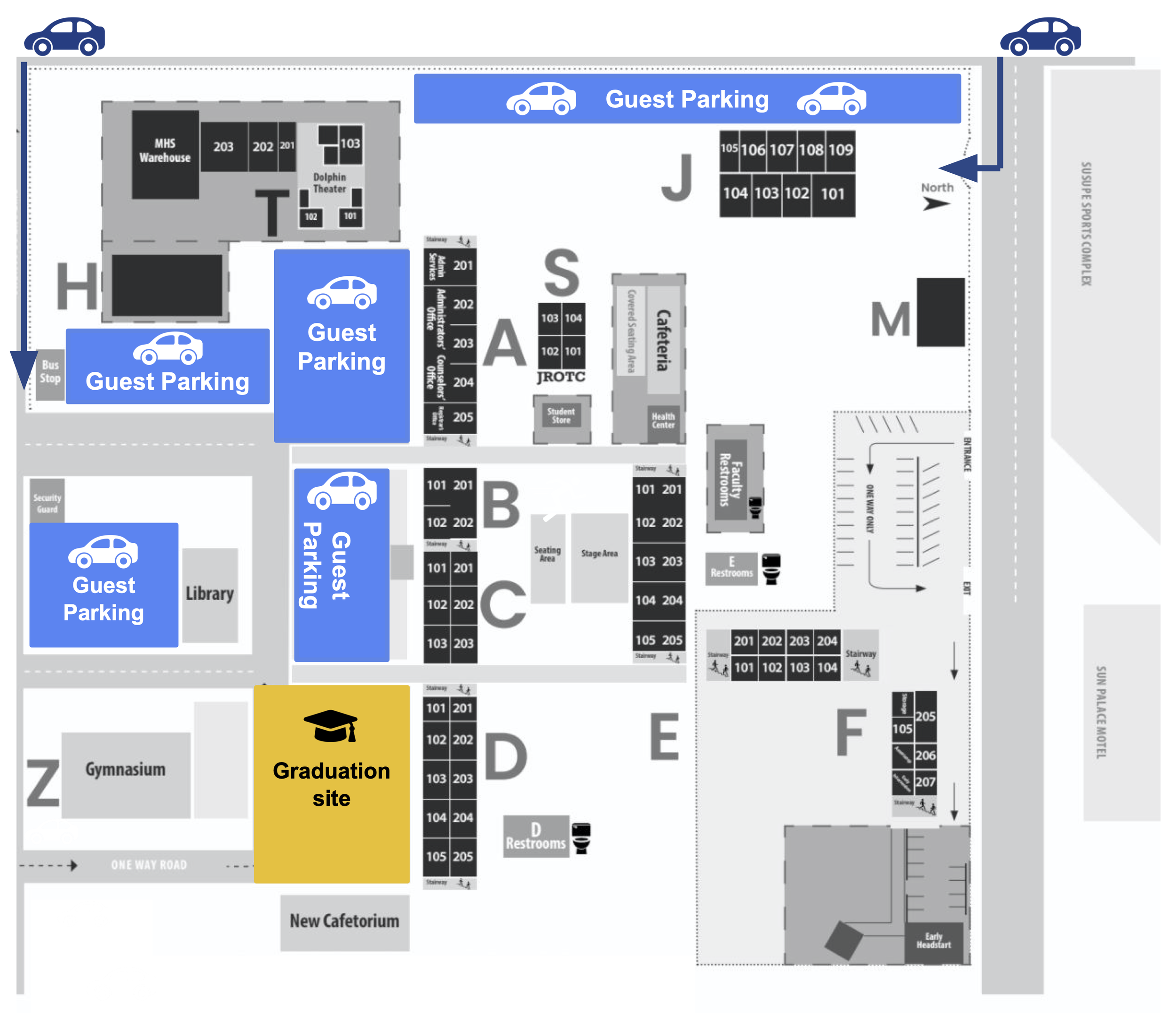 Guest and graduate parking are designated in the map on this page. Please follow the instructions of the MHS staff and JROTC cadets on parking detail.